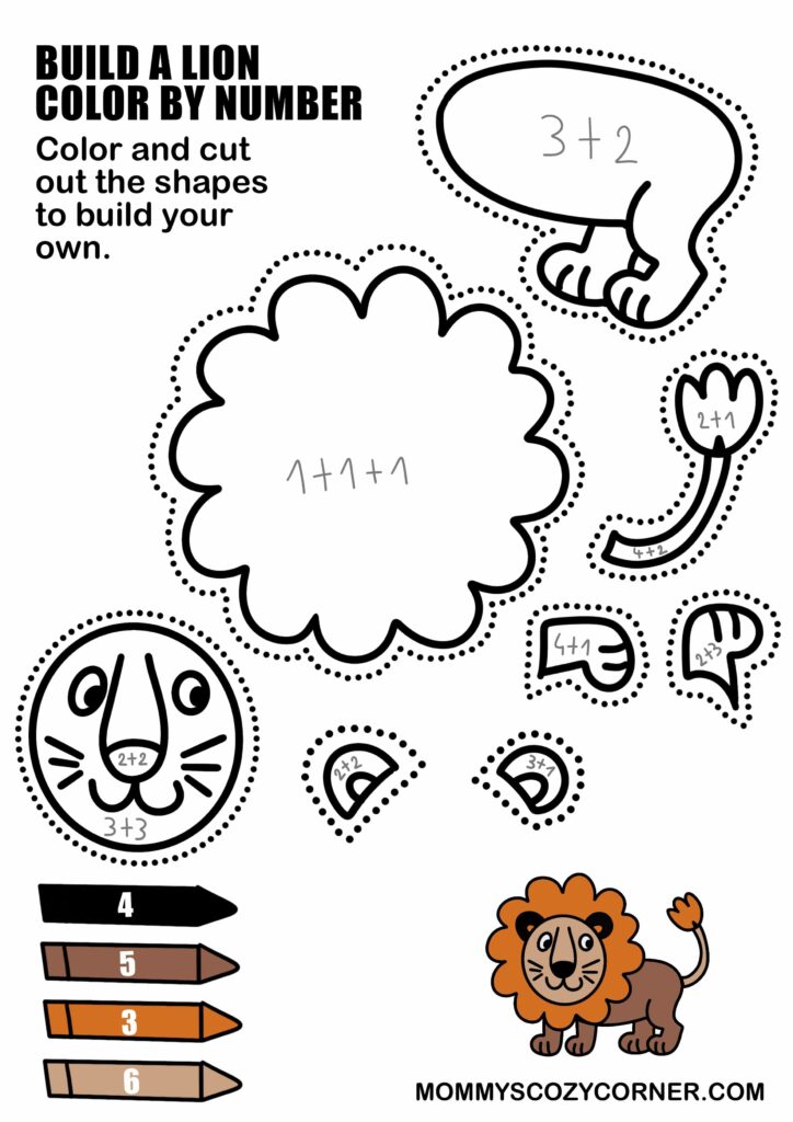 This free Lion kids printable is a mix between “my build your own” printables and my “color by number” printables so your kids get two activities in one!I love “Build Your Own” templates for kids as they allow them to learn new objects, animals and work on their motricity at the same time while having lots of fun. At the same time, “color by number” printables help with learning math and matching a result with a color!