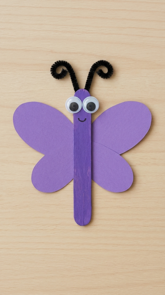 Kids paint the popsicle stick purple, then cut four oval wing shapes from the purple cardstock — two larger ones for the top wings and two smaller ones for the bottom. The wings get glued to the back of the stick, the googly eyes go on the top, the pipe cleaner is bent into two curly antennae, and a small smile is drawn on with black marker. Done in minutes and absolutely adorable.
