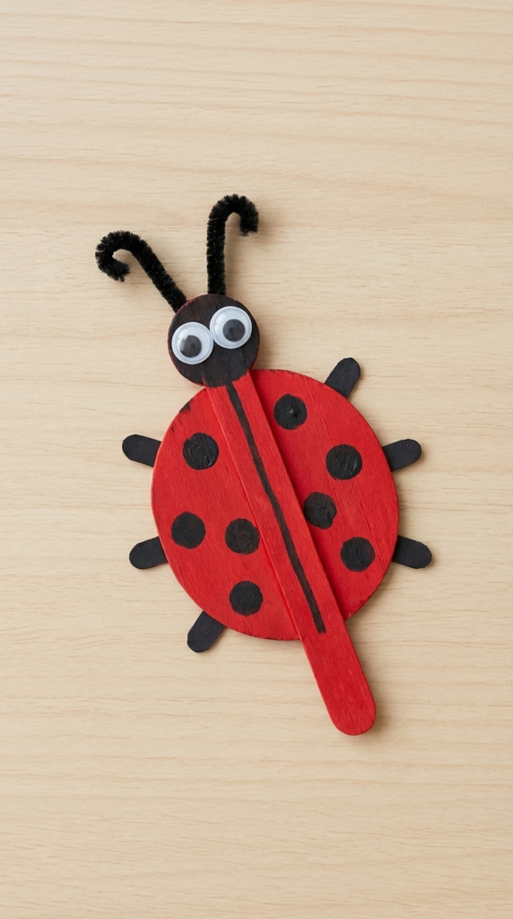 To make it, kids paint the sticks red and arrange them in a rounded oval shape to form the ladybug’s body, then paint one stick black for the centre line. The black pipe cleaner gets bent into two antennae, the googly eyes are glued on, and black dots are painted all over the wings. Simple, satisfying, and very cute once it all comes together.
