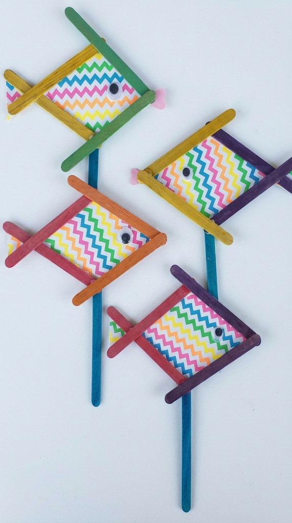 Next is the fish. All you need for this craft are popsicle sticks, colored paper, beads, and googly eyes. Kids will glue the sticks together in a triangular shape and then decorate with colored paper and beads. This fish design is simple and fun, taking around 20 to 25 minutes to put together.